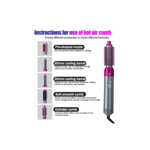 5 In 1 Hair Styler For Women Multifunctional Styling Tool With 5 Attachments 1 Hot Air Brush,2 Spiral Curler,1 Hair Dryer,1 Hair Straightner Comb.