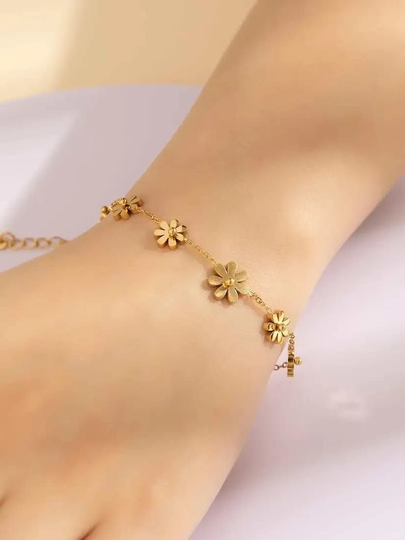 Elevate your style with this elegant 22K gold plated flower chain bracelet, a perfect blend of durability, beauty, and timeless charm. Designed with delicate daisy-shaped flowers linked gracefully along a fine chain, this bracelet symbolizes elegance, positivity, and sophistication. Crafted from high-quality stainless steel, it offers strength and resilience, ensuring long-lasting wear without losing its shine. The premium 22K gold plating enhances its rich appearance, making it a versatile accessory for both everyday wear and special occasions.