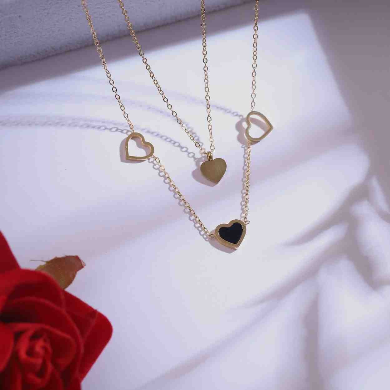 Embrace timeless elegance with the Golden Heart Pendant & Earrings Set. Featuring two delicate heart pendants—one with a sleek black enamel finish and the other with a minimal gold tone—this set captures both modern charm and classic style. Paired with matching golden heart stud earrings, it’s the perfect accessory for daily wear or as a thoughtful gift for someone special.