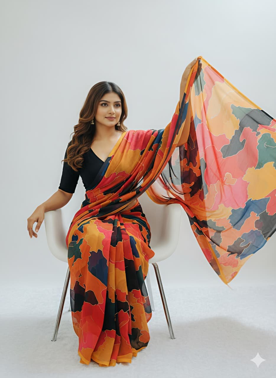 Fabric details - Soft & smooth marshmellow georgette with mosaic digital print comes with a beautiful black mul cotton Blouse